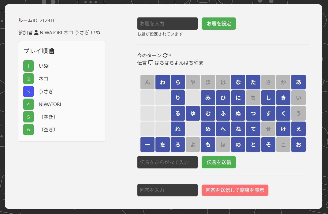 最後の人が回答すると全員に「お題」「これまでの伝言」「最後の人の回答」が表示されます